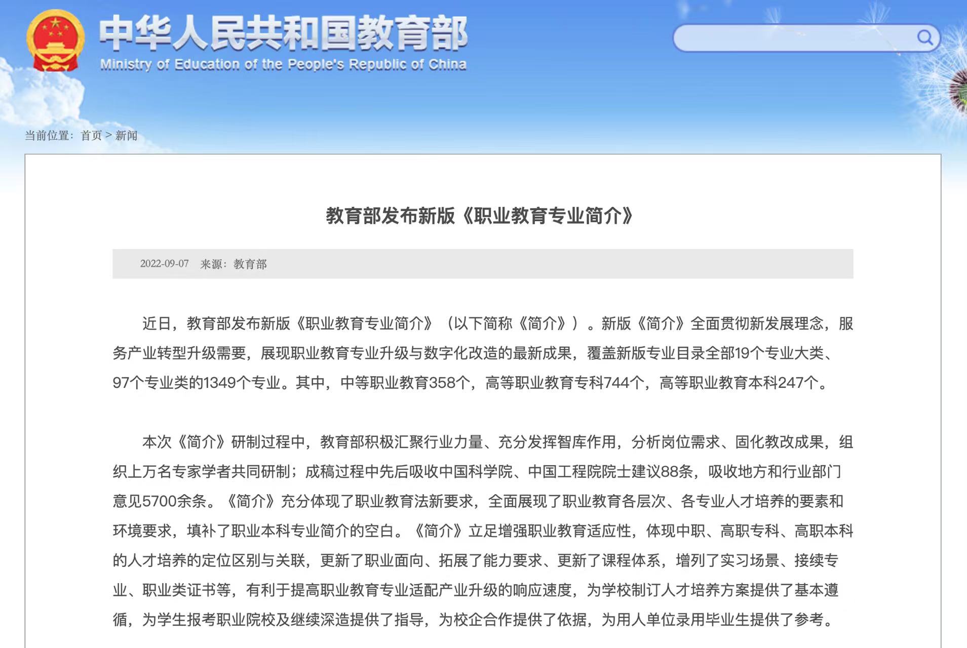 日前,教育部發(fā)布新版《職業(yè)教育專(zhuān)業(yè)簡(jiǎn)介》(以下簡(jiǎn)稱(chēng)《簡(jiǎn)介》),新版《簡(jiǎn)介》全面貫徹新發(fā)展理念,展現(xiàn)職業(yè)教育專(zhuān)業(yè)升級(jí)與數(shù)字化改造的最新成果,覆蓋新版專(zhuān)業(yè)目錄全部19個(gè)專(zhuān)業(yè)大類(lèi)、97個(gè)專(zhuān)業(yè)類(lèi)的1349個(gè)專(zhuān)業(yè)。